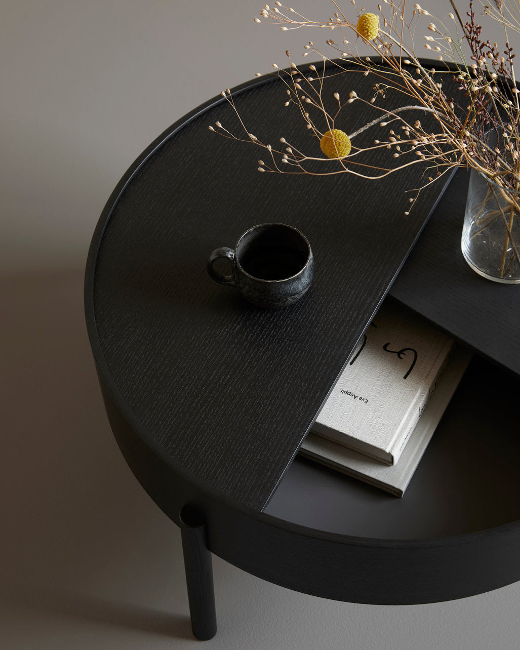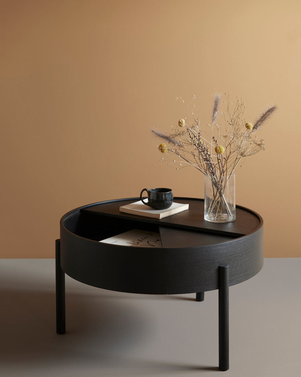 The Arc table invites its user to make use of the simple functionalities, use one finger to turn the upper tabletop. Let it be open with your favourite objects on display or close the lid to hide your mess. The surface on the inside storage space is covered with a smooth nanolaminate to complement the wood while the three-legged construction adds a playful and light touch to the geometric shaped design.