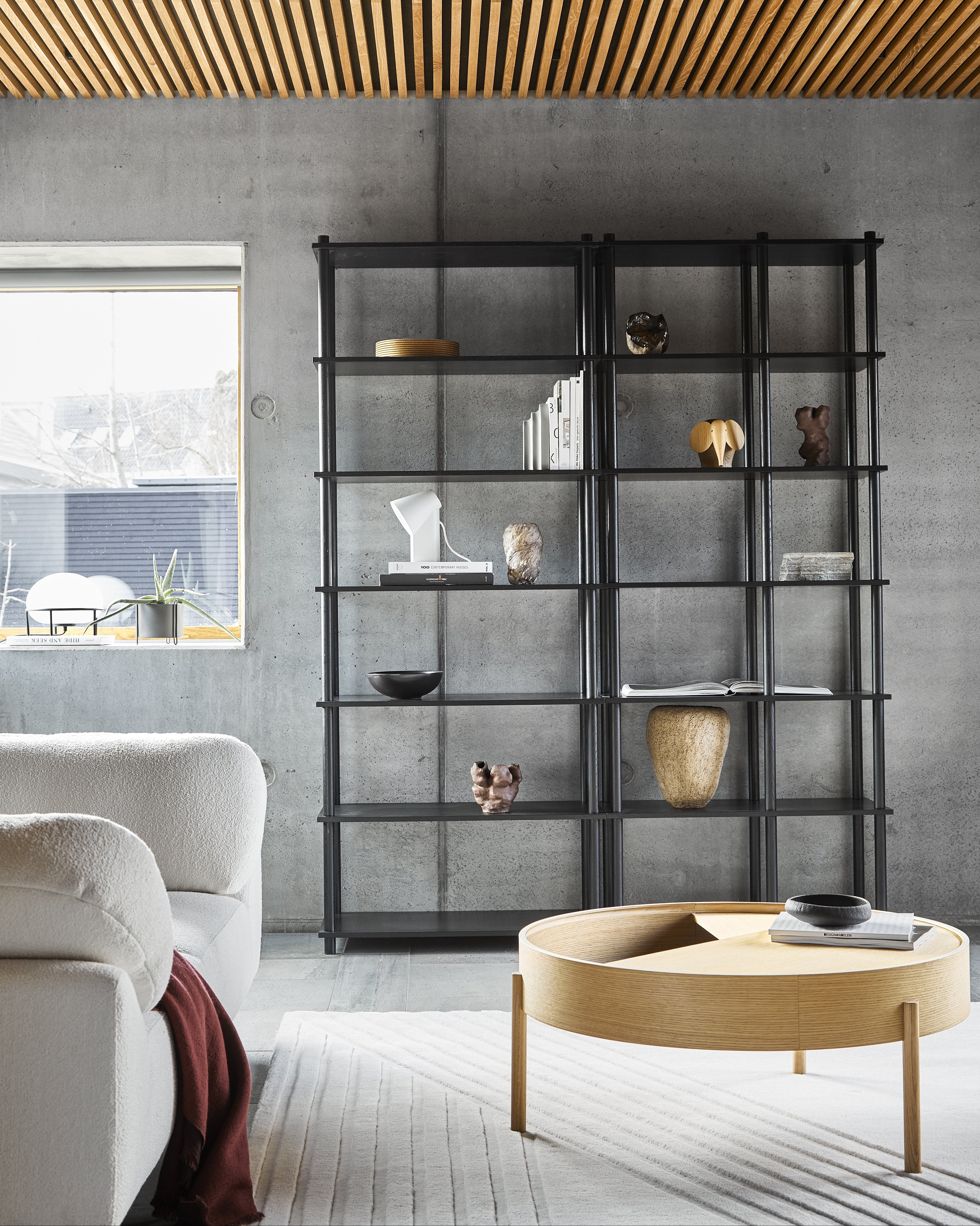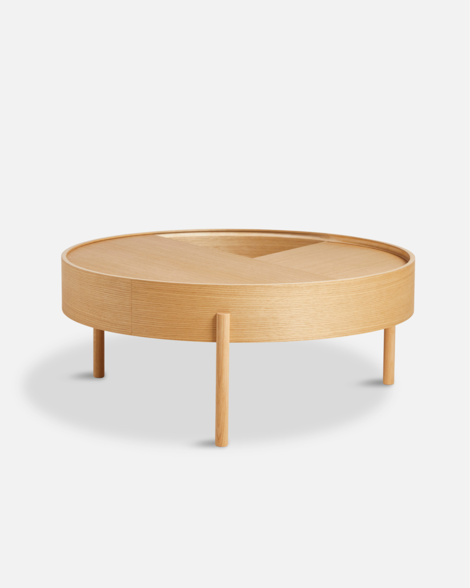 The Arc table invites its user to make use of the simple functionalities, use one finger to turn the upper tabletop. Let it be open with your favourite objects on display or close the lid to hide your mess. The surface on the inside storage space is covered with a smooth nanolaminate to complement the wood while the three-legged construction adds a playful and light touch to the geometric shaped design.