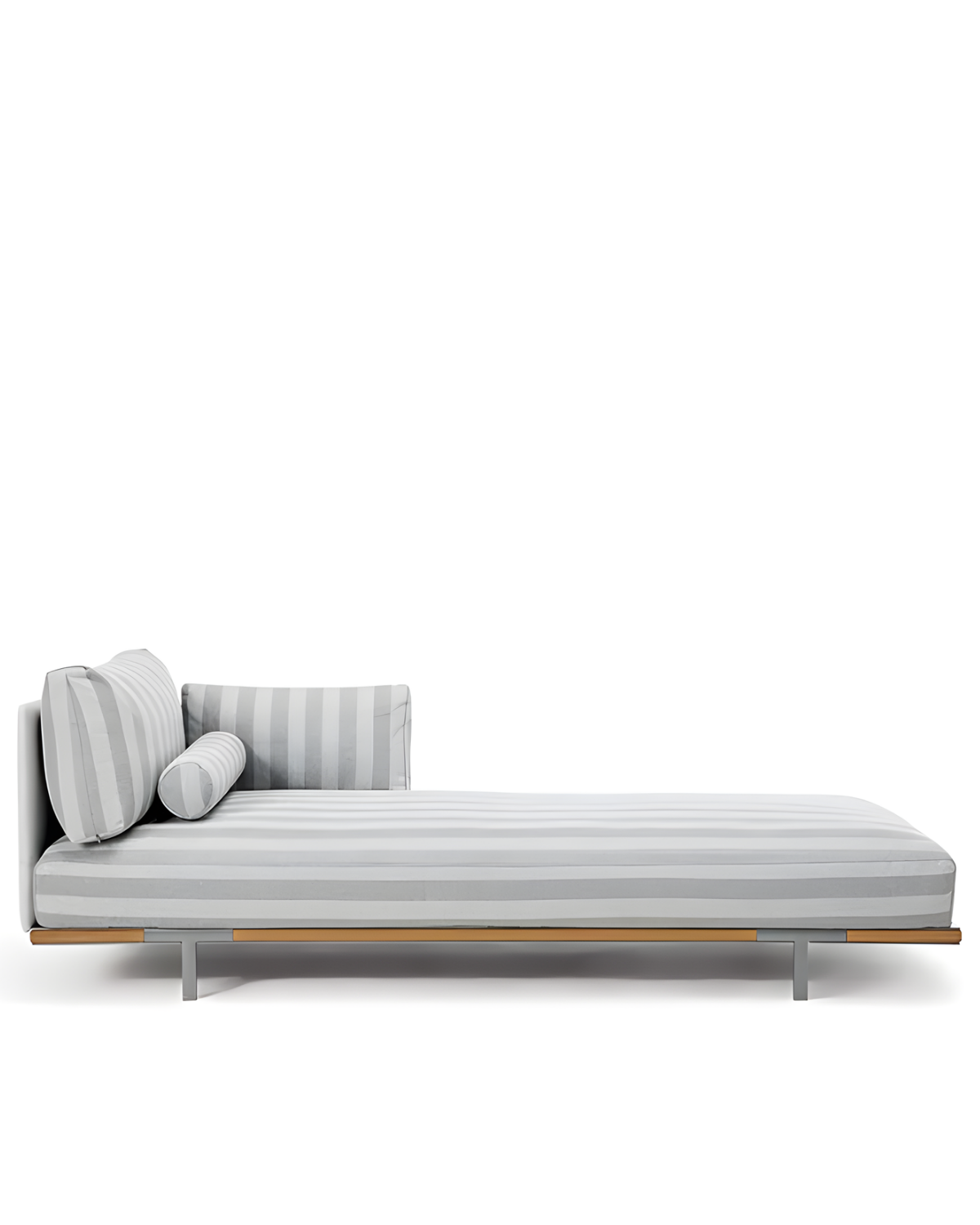 The Baia Daybed is made with a textured matt carbon and natural teak/textured matt carbon and Accoya/only textured matt carbon/textured matt silver and natural teak/textured matt silver and Accoya/only textured matt silver frame, and polypropylene maiorca/polypropylene maiorca and polypropylene navy/linen colour and faux-leather cushion colours.