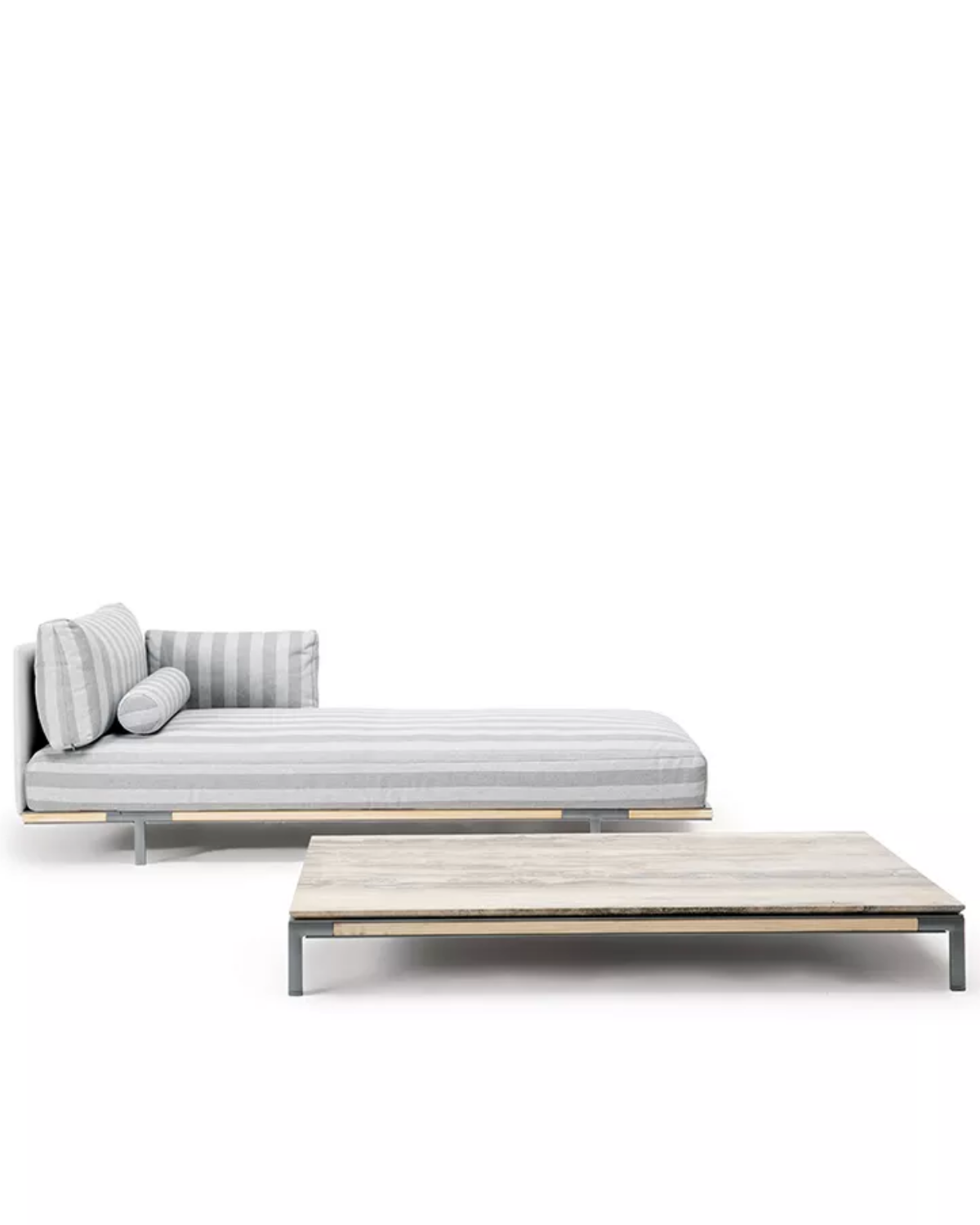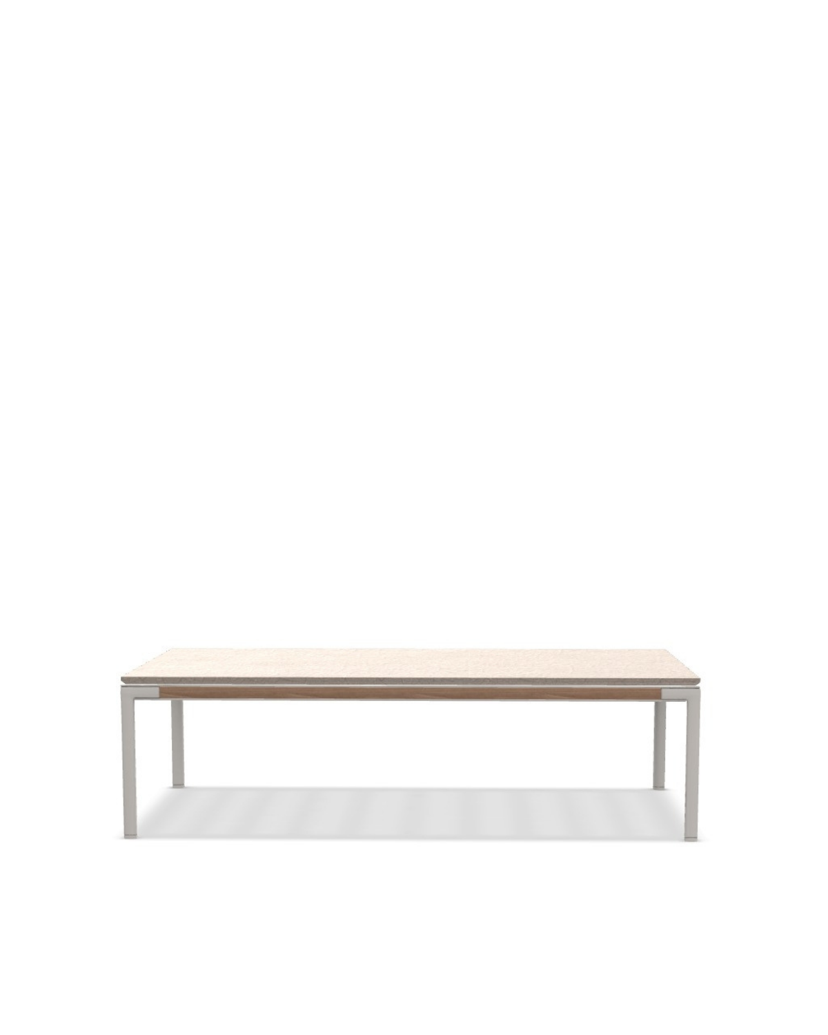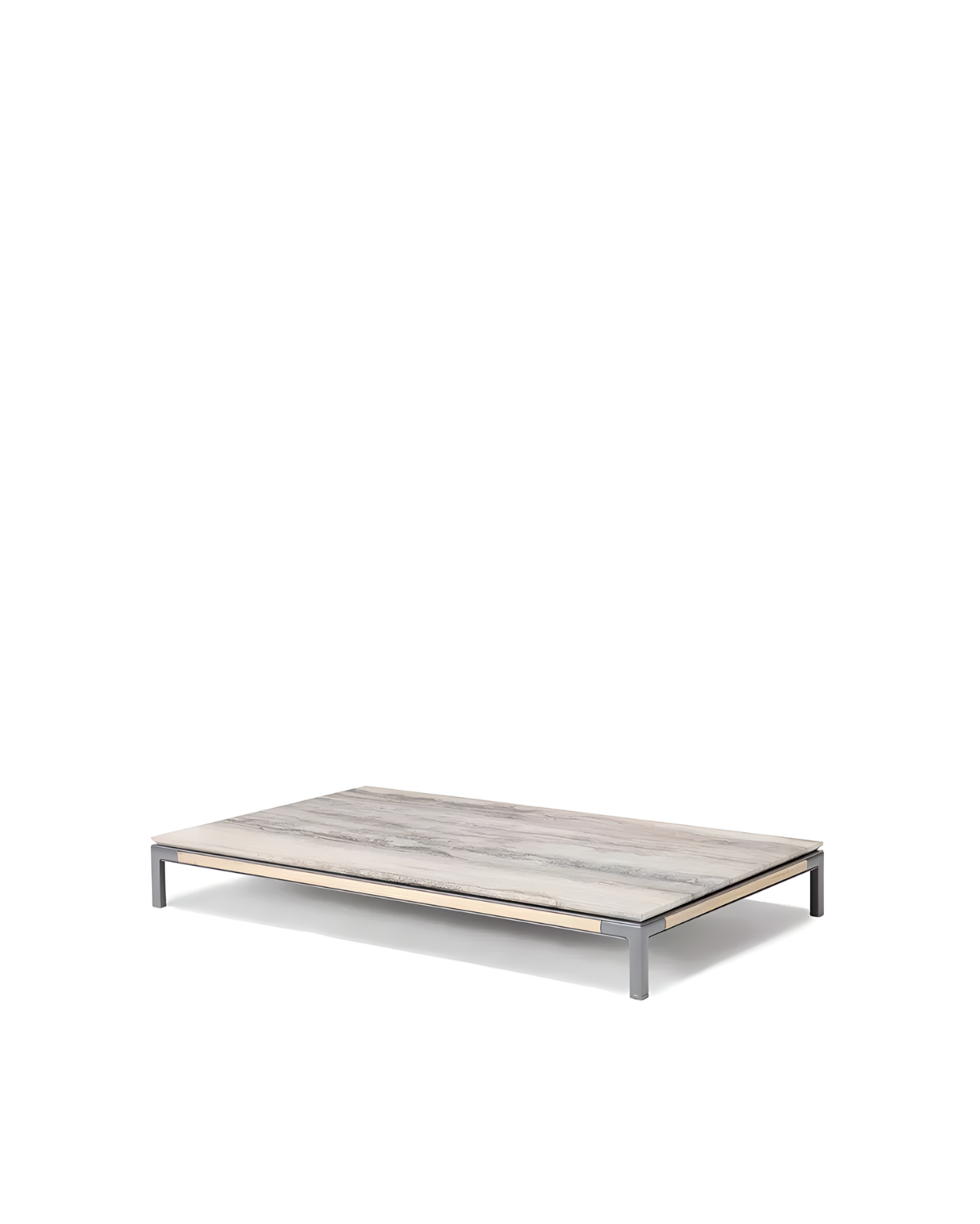 The Baia Rectangular Coffee Table is made with a textured matt carbon and natural teak/textured matt carbon and Accoya/only textured matt carbon/textured matt silver and natural teak/textured matt silver and Accoya/only textured matt silver frame, and travertino silver/travertino/enamelled lava stone bone white table top.