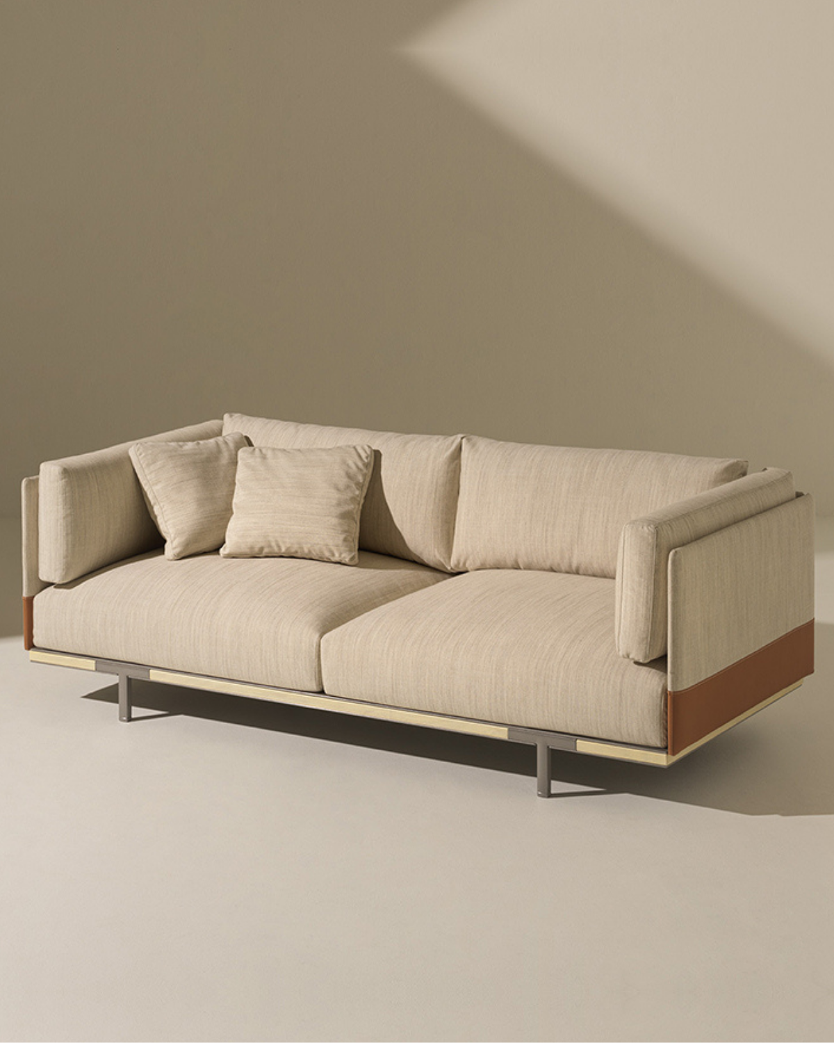 Baia has soft cushions resting on a base bordered by a system of fabric-upholstered panels. All the upholstery, with a soft comfortable handle, have properties and characteristics that ensure their performance in any outdoor context or situation and ensure that the furnishings preserve all their original beauty and function over time.