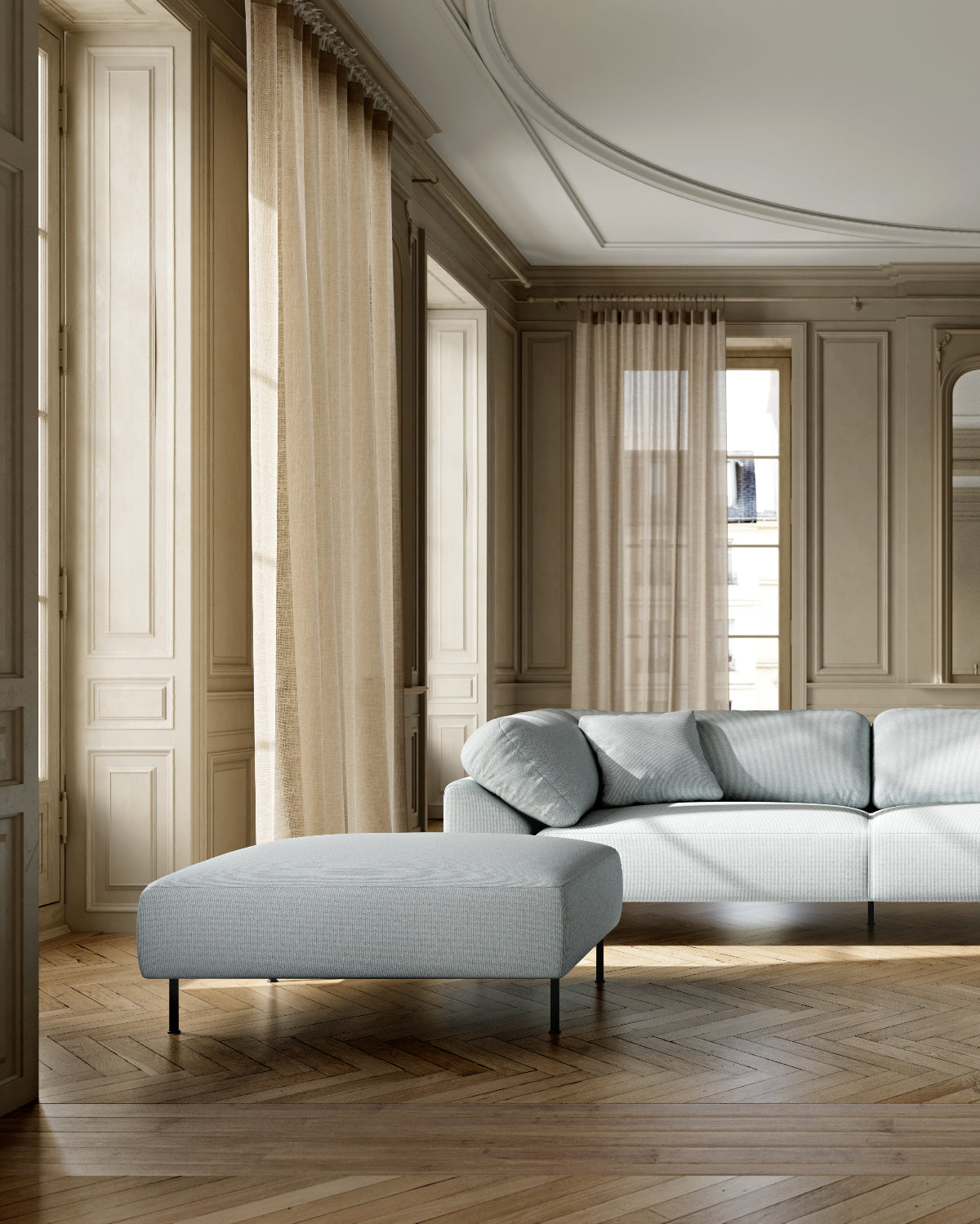 Using voluminous curves and askew-arranged back cushions, Collar reinterprets classic sofa design into a contemporary appealing appearance. Combined with the low backrest, the continuous back cushion functions as a collar and when sinking into the carefully selected soft memory foam you achieve the feeling of a soft hug. The series consists of different modules, allowing for various combinations to suit different needs.