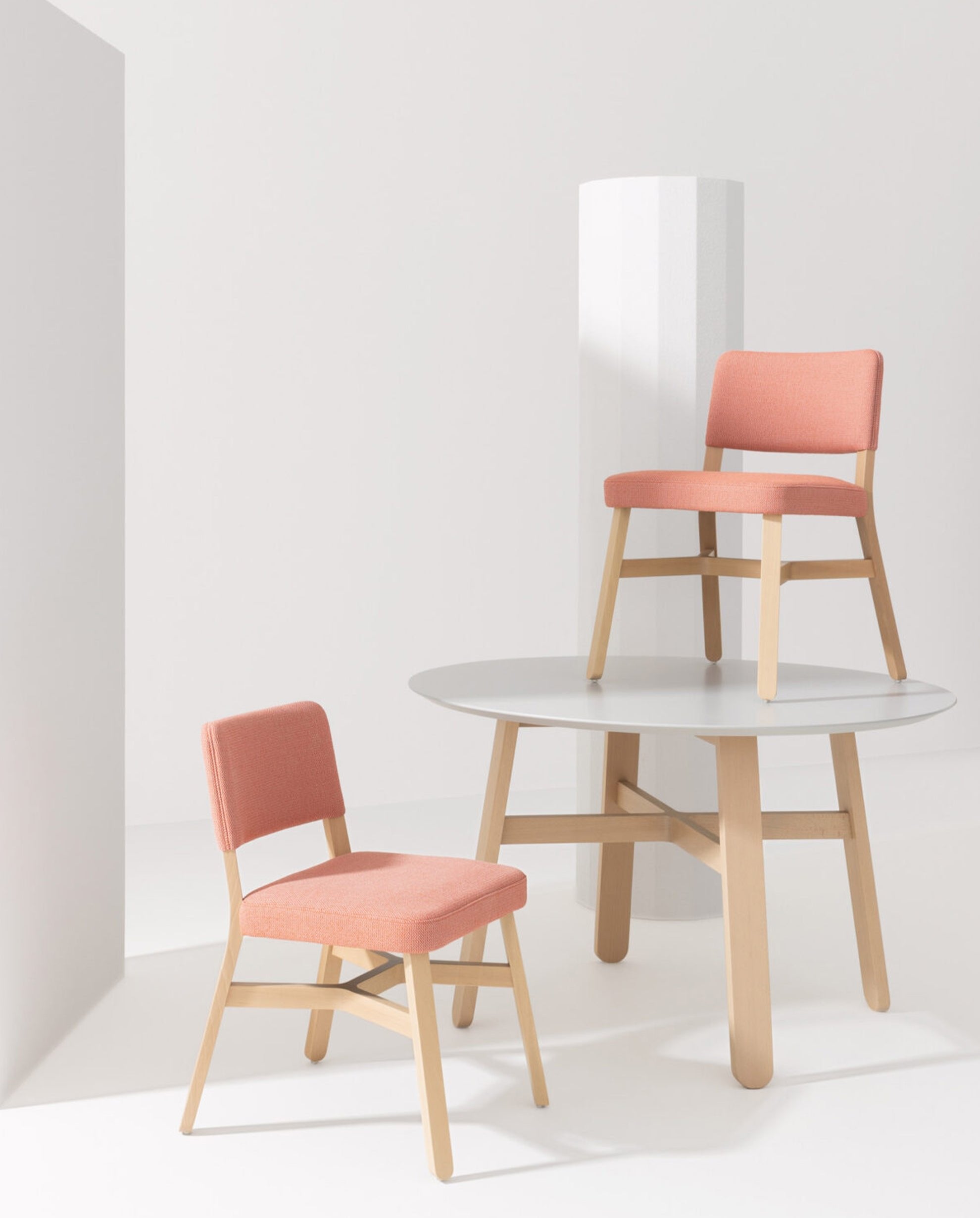 Billiani opened up to the world of upholstery with a rich collection that includes chair, armchair and lounge chair, barstool, sofa, pouf, bench and table. Unifying elements are the cross and the rounded legs, while the armchair, lounge chair and sofa share a common curved back, in the shape of a croissant. A collection that meets the needs of those places that bring together different functions but are looking for stylistic continuity.
