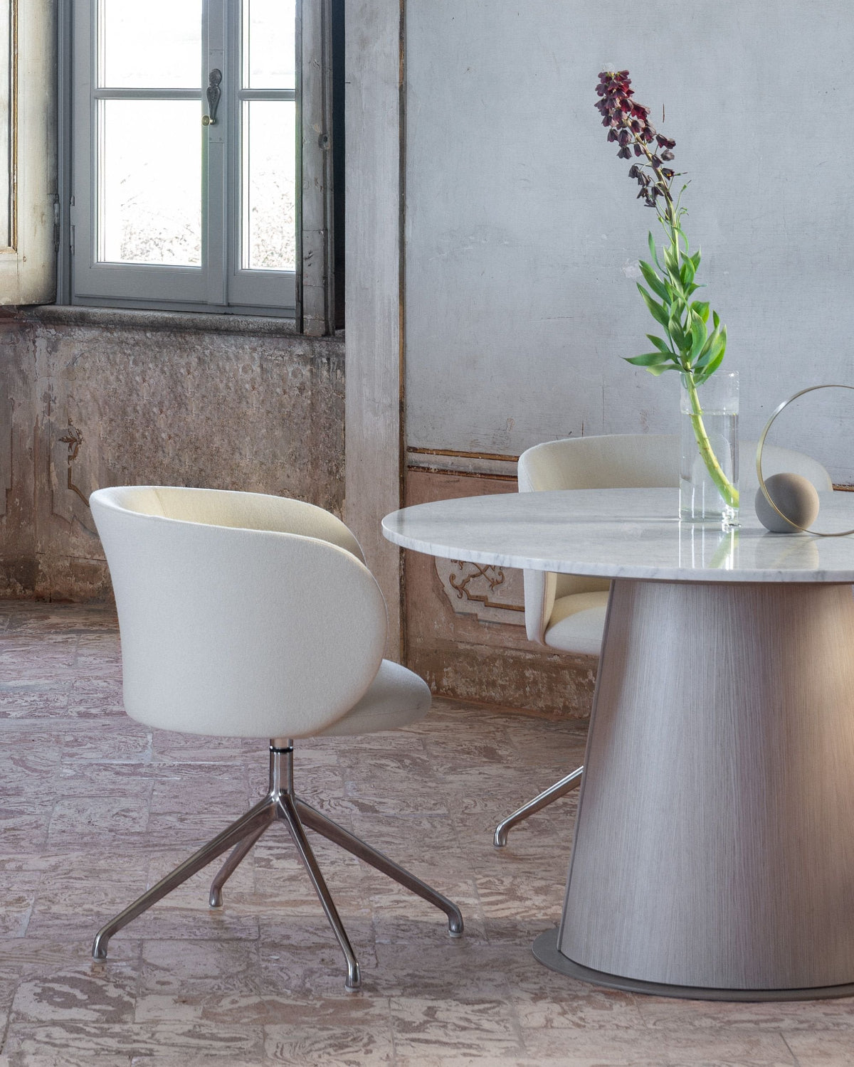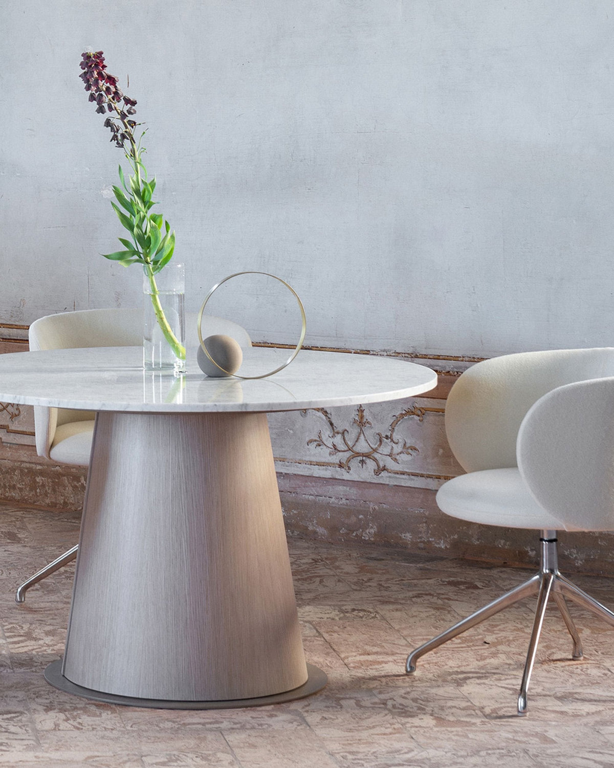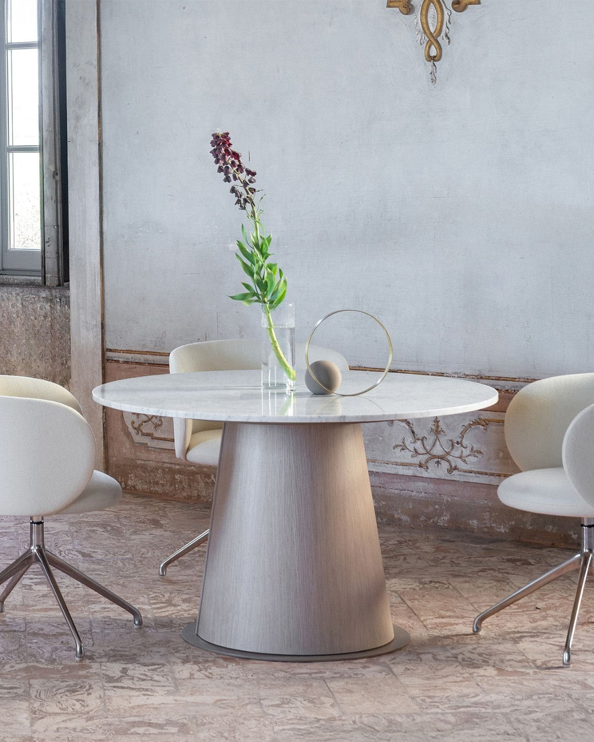 Duomo is a Carrara marble and wooden meeting table perfect for the office environment. It’s very adaptable, perfectly at home in a meeting room or used in a private office as an accessory table to the main desk. The supporting structure forms a single semi-conical volume composed of wood-lined metal. The structure can be easily accessed if and when it’s necessary to carry out some quick maintenance on the electrical system. The Carrara marble top possesses a central metal-lined hole for easy cable routing: maximum functionality combined with a clean, essential aesthetic. As it has a single central leg, a metal sub-top provides the table with added stability and, in matching the circular metal ground support base, it simultaneously bestows a touch of formal elegance.