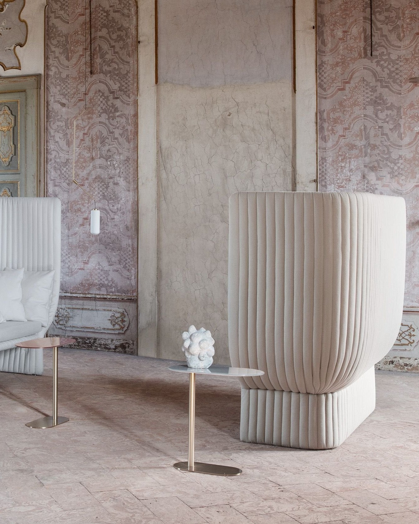Ghisolfa is a seating range created for individual moments or private sharing. The high back armchair or the sofa when coupled at the front emphasize even more the privacy effect and a real protected area. The thickness of the quilted padding and the fabric cover foster a feeling of sound isolation so Ghisolfa are ideal for informal meetings and conversations in total comfort. A low version more suitable for group meetings or conversation areas is also available.