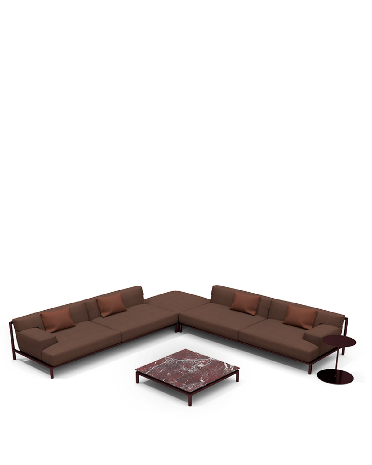 The Lodge Backend Module Right/Left is made with trevira brown/trevira dark taupe/acrylic walnut/acrylic moss structure and metal glossy kaki/metal glossy black red/metal glossy radice/metal glossy sesamo cushion colours.