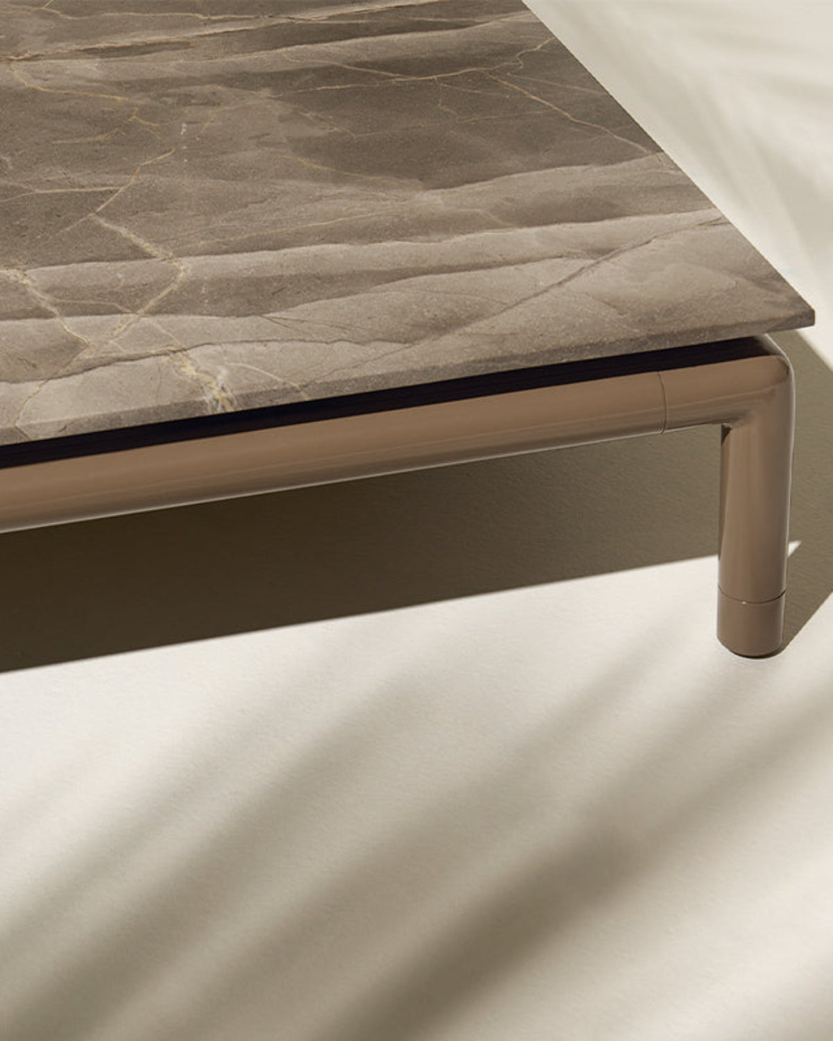 The Lodge Coffee Table is made with metal glossy kaki/metal glossy black red/metal glossy radice/metal glossy sesamo structure and marmo fiore di bosco/marmo dark red/enamelled lava stone bone white/enamelled lava stone oliva/amaranto table top colours.