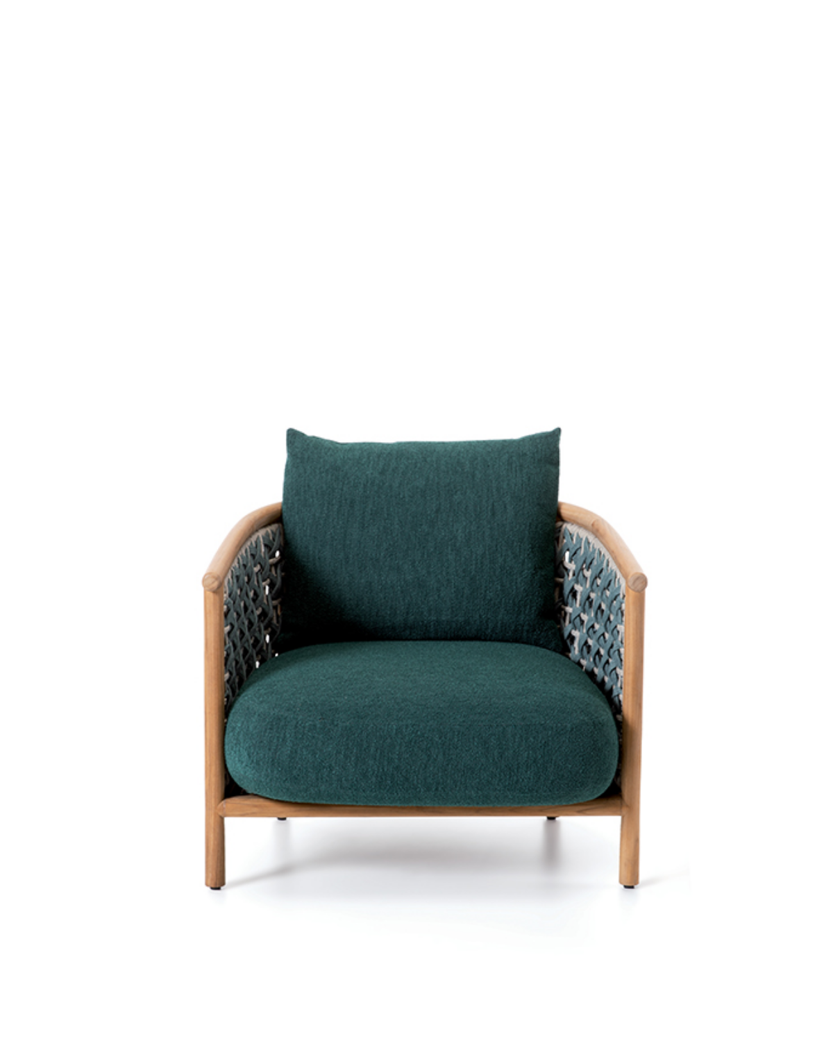 The Patio Lounge Armchair fetures a natural teak frame with rope, and a light grey/laguna/deep green cushion.