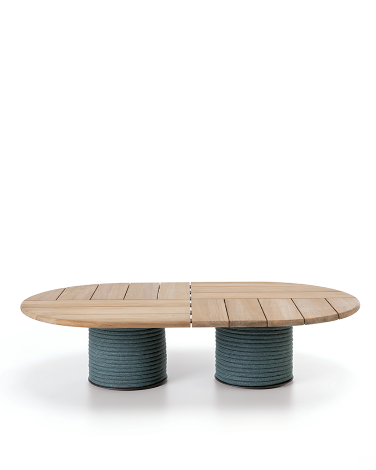 The Patio Coffee Table features a flat rope base with a light grey top muschio.