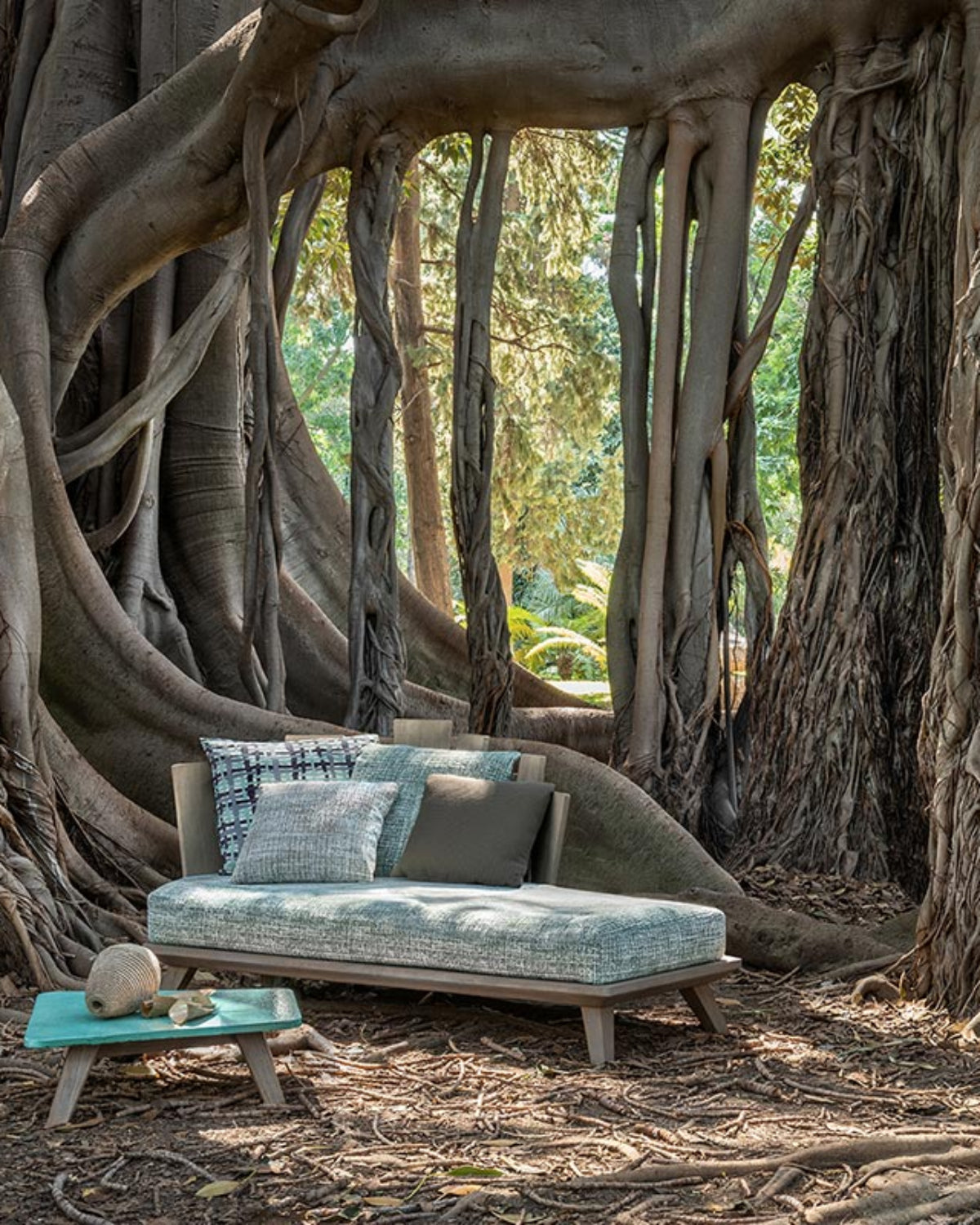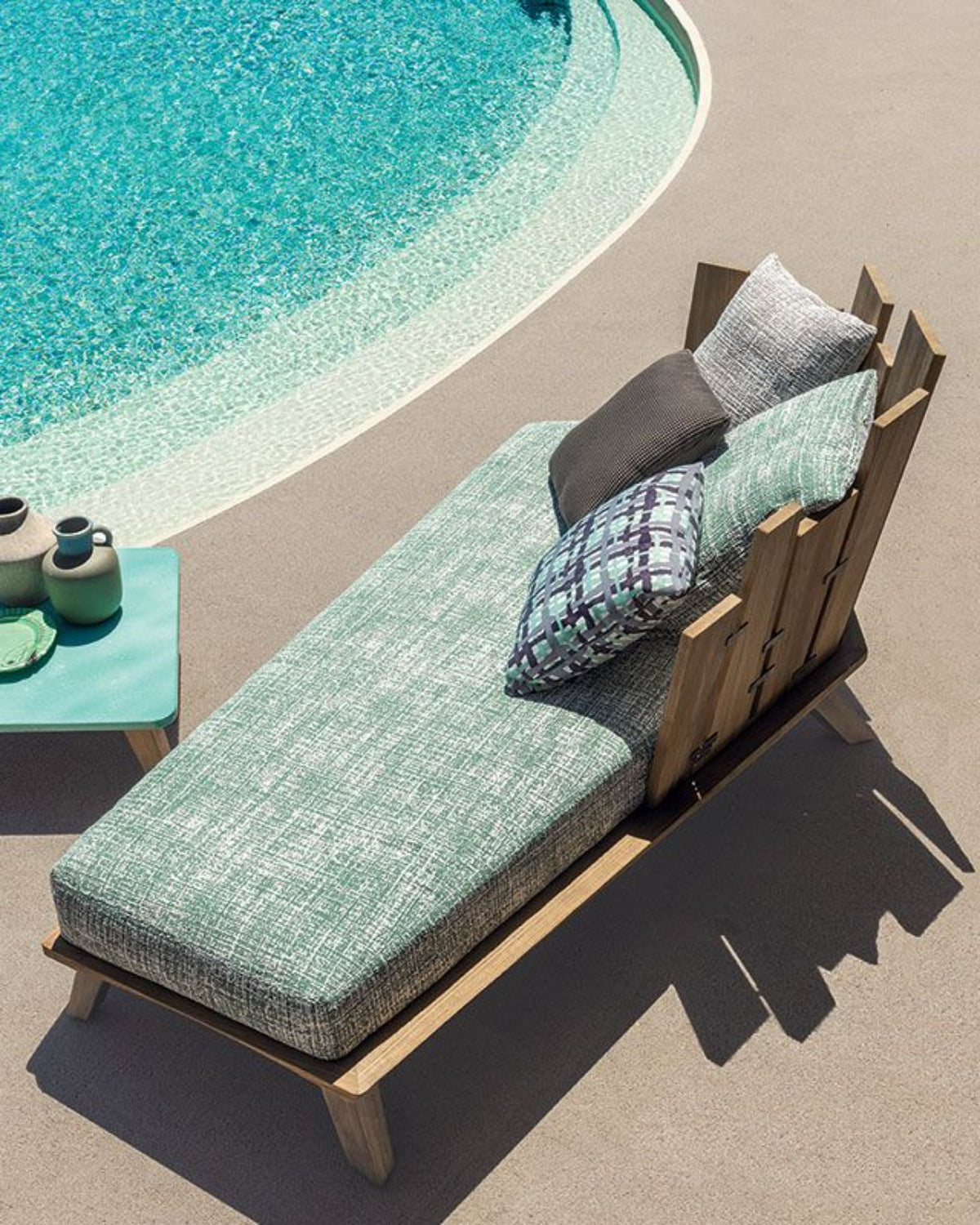 Rafael is a collection with an unusual appearance and strong character, influenced by the versatility and transience of nature. The sturdy structure in brushed teak, with metal staples that add a touch of craftsmanship, meets the textures and shades of the cushions, in a compositional dialogue in which the tables in white marble or stone glazed in the color of the sea are inserted. Fine artisan crafting of teak, marble and lava stone in fact combines with the sophisticated range of textile colours, again designed by Paola Navone, that enhance the padded furniture.