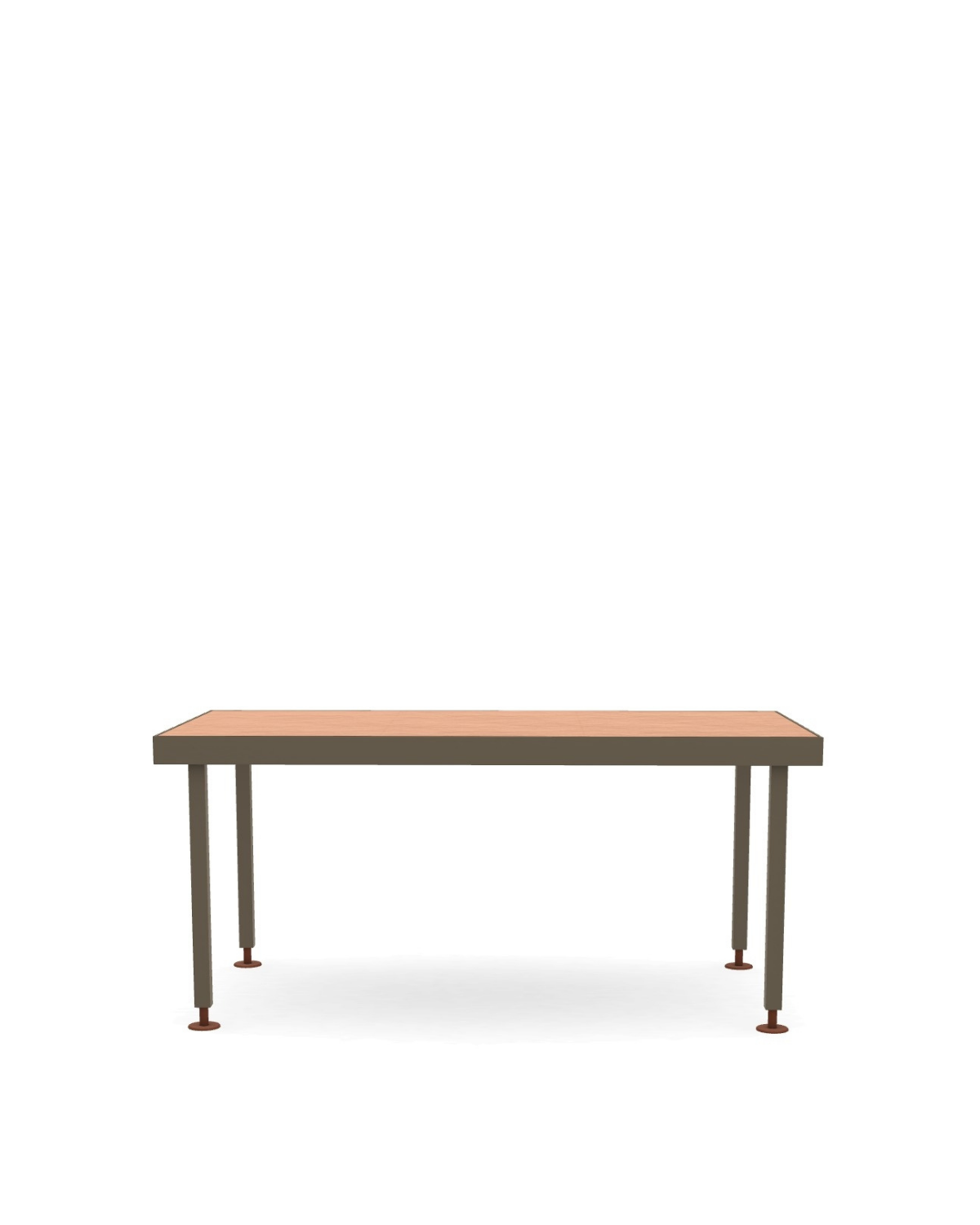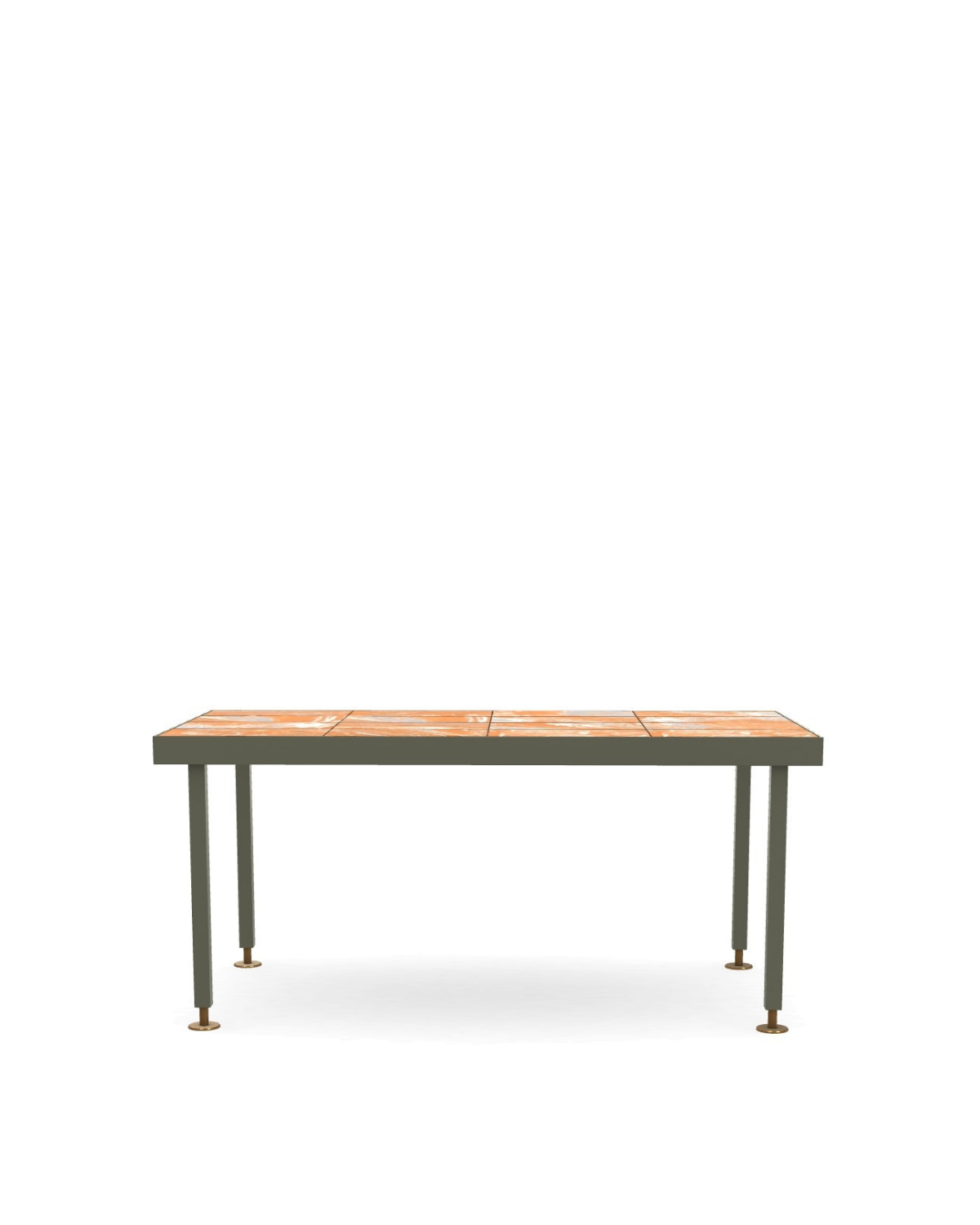 The Seeds Dining Table is made with aluminium camouflage grey and metal russet scarabea/aluminium camouflage green and metal soft touch burnished brass/textured limestone white and metal glossy grey gold structure, and laminam calce terracotta/natural teak/terracotta + glass table top colours.