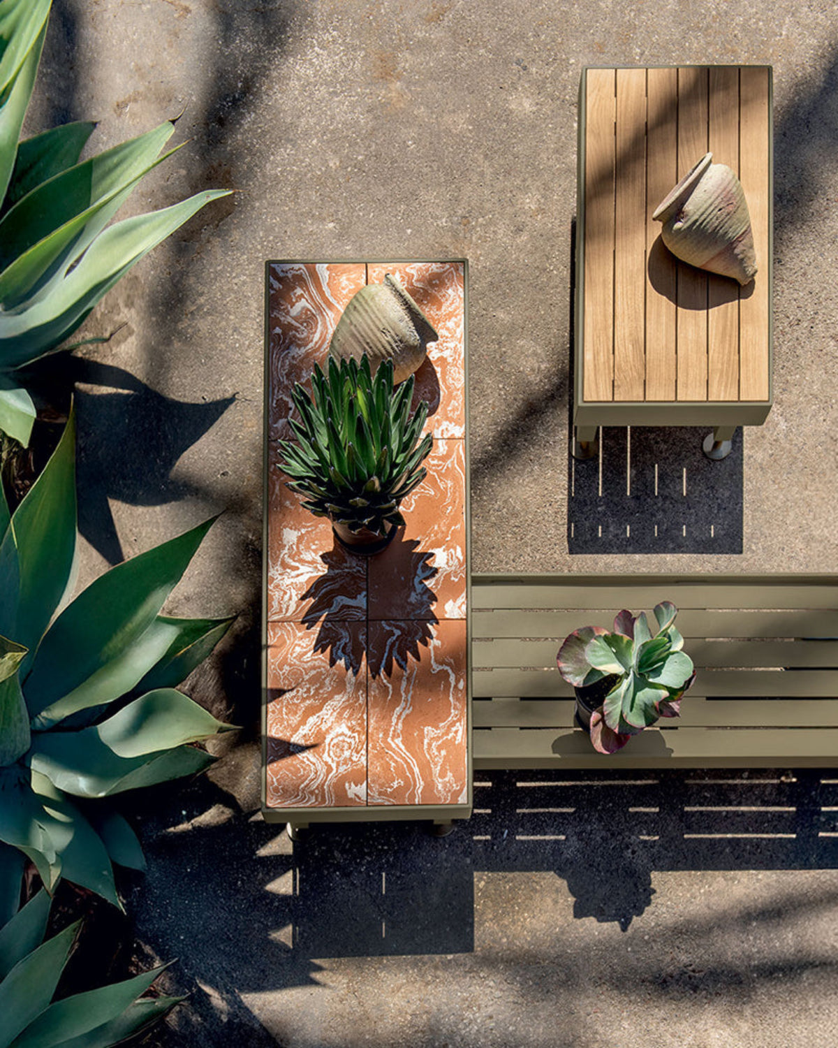 Botanical charm inspires outdoor design. Ethimo and Cristina Celestino have created an eclectic collection of benches and tables for outdoor living in simplicity and harmony. The evocative and symbolic name Seeds, a reference to the world of gardening and traditional greenhouse and nursery furnishings, was chosen to describe a collection essential in its forms yet elegant in its details, where warm and fine materials like terracotta and natural teak come together in a sophisticated balance of textures and processes.