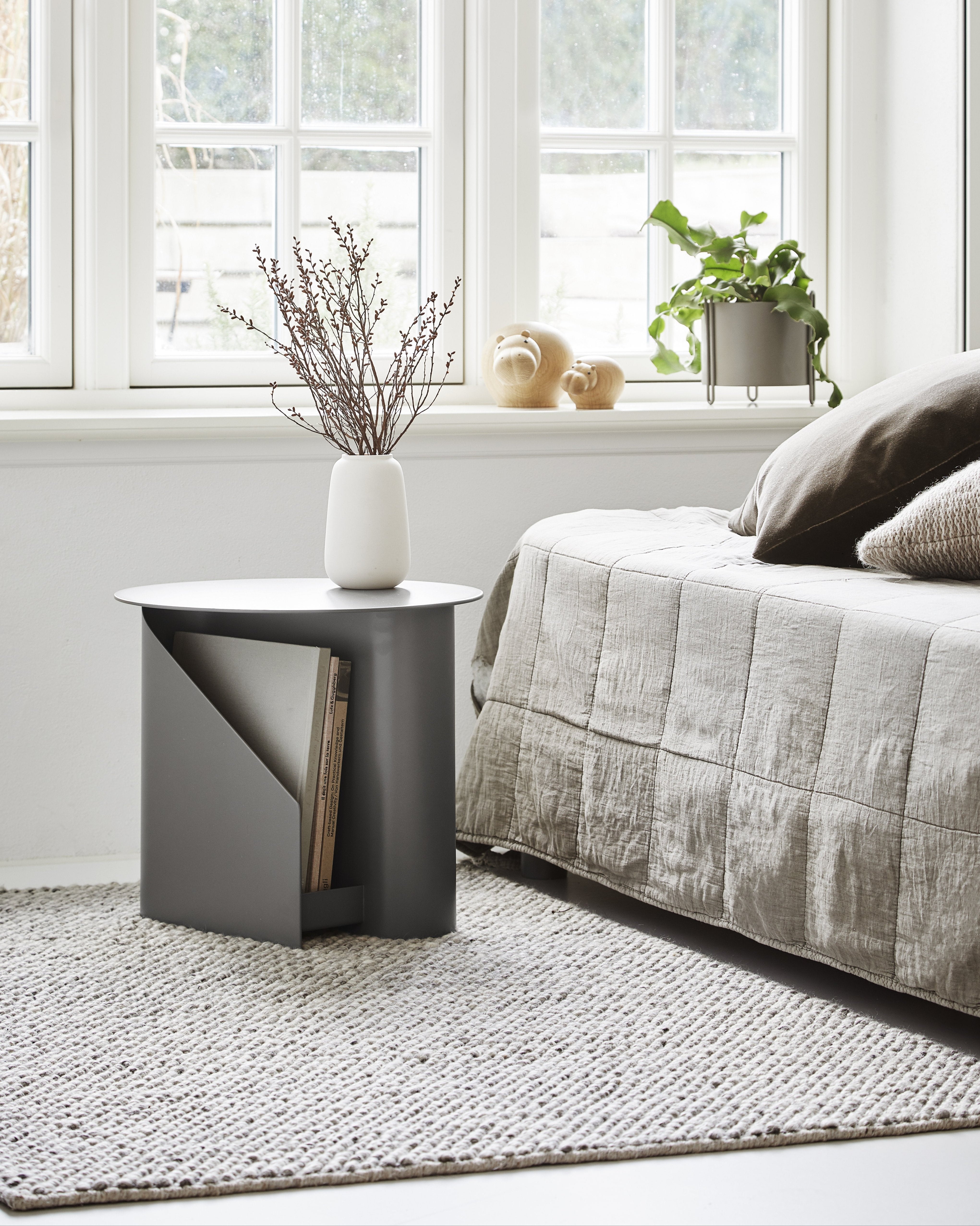 The Sentrum side table follows the principle of simplicity as it has been stripped from all unnecessary elements. What is left is a strong base and geometrical expression with pure functionalities. The S-shaped construction makes the centre of attention and creates two spaces for storage on both sides to enhance the usability of the side table - ideal for magazines and books.