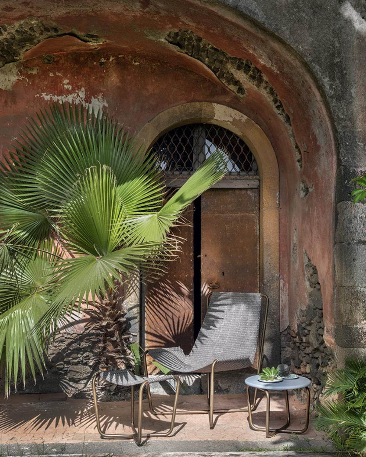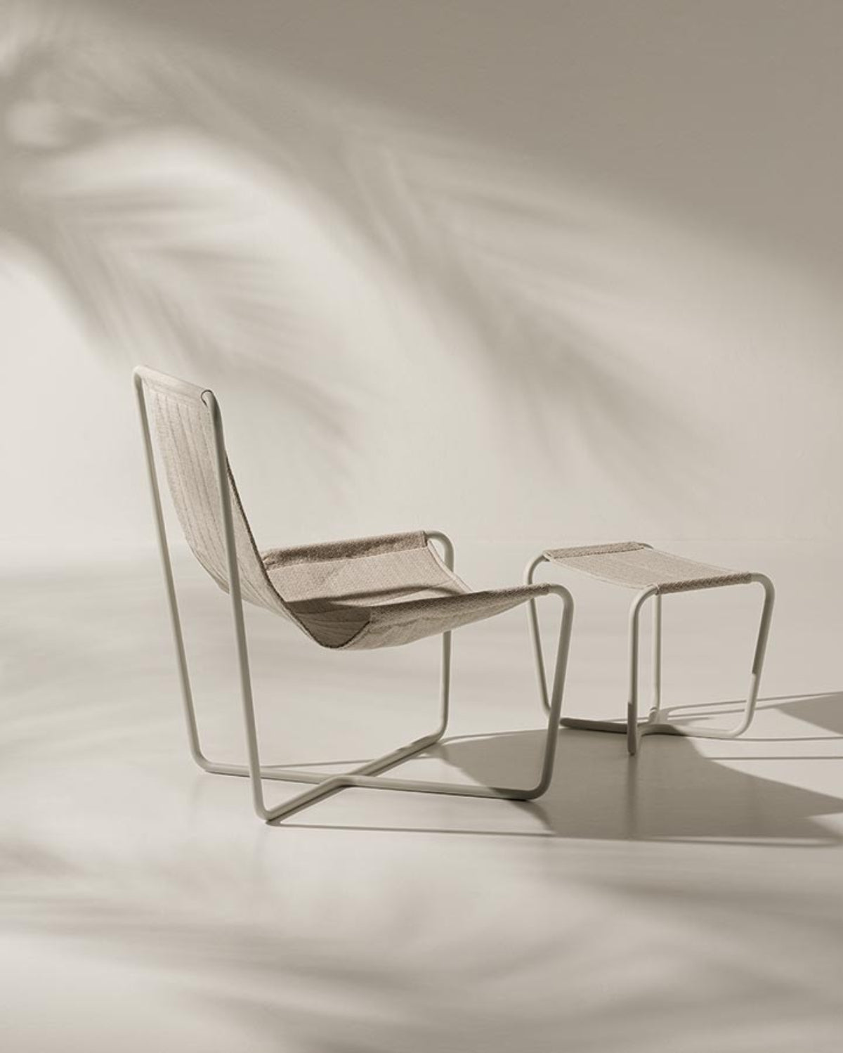 Sling chair is complemented by a coffee table with a matching steel frame and top in a special pigmented concrete mix that enhances its texture while lending it lightness and elegantly and originally tempering the solidity and compactness of this material. Ethimo and Studiopepe come together with a project articulated in unusual combinations of colours and materials, evoking the laidback elegance so typical of holidays.