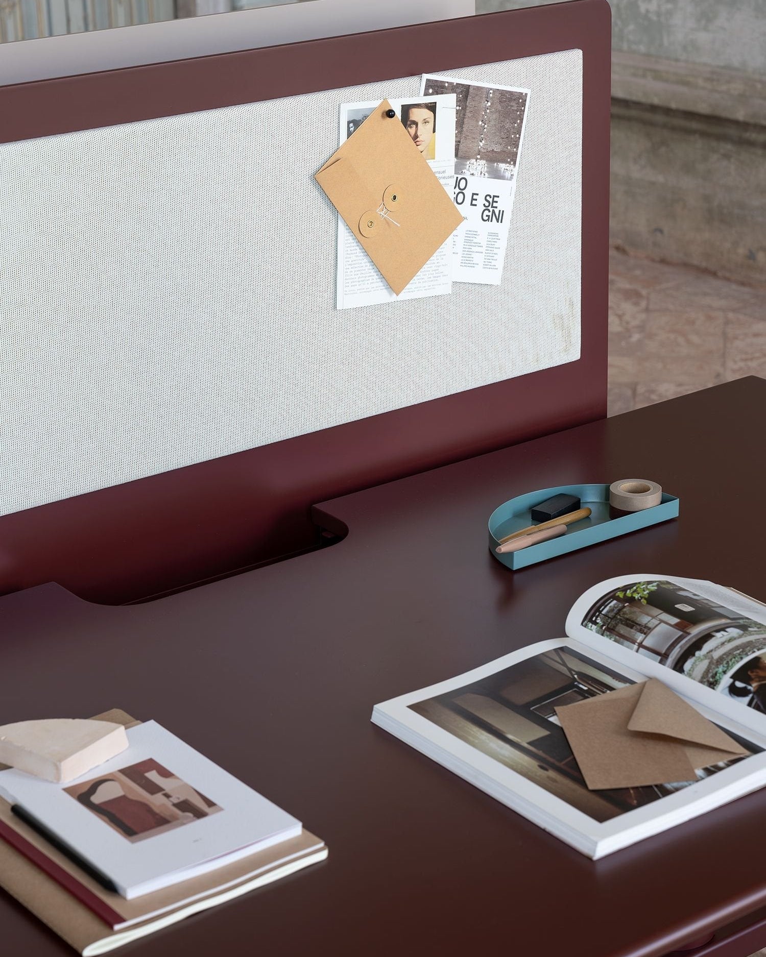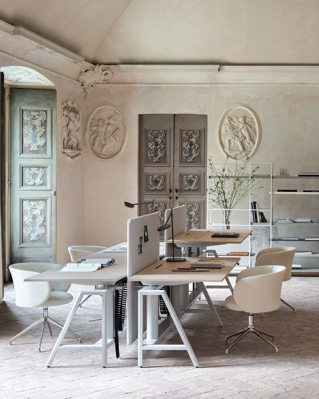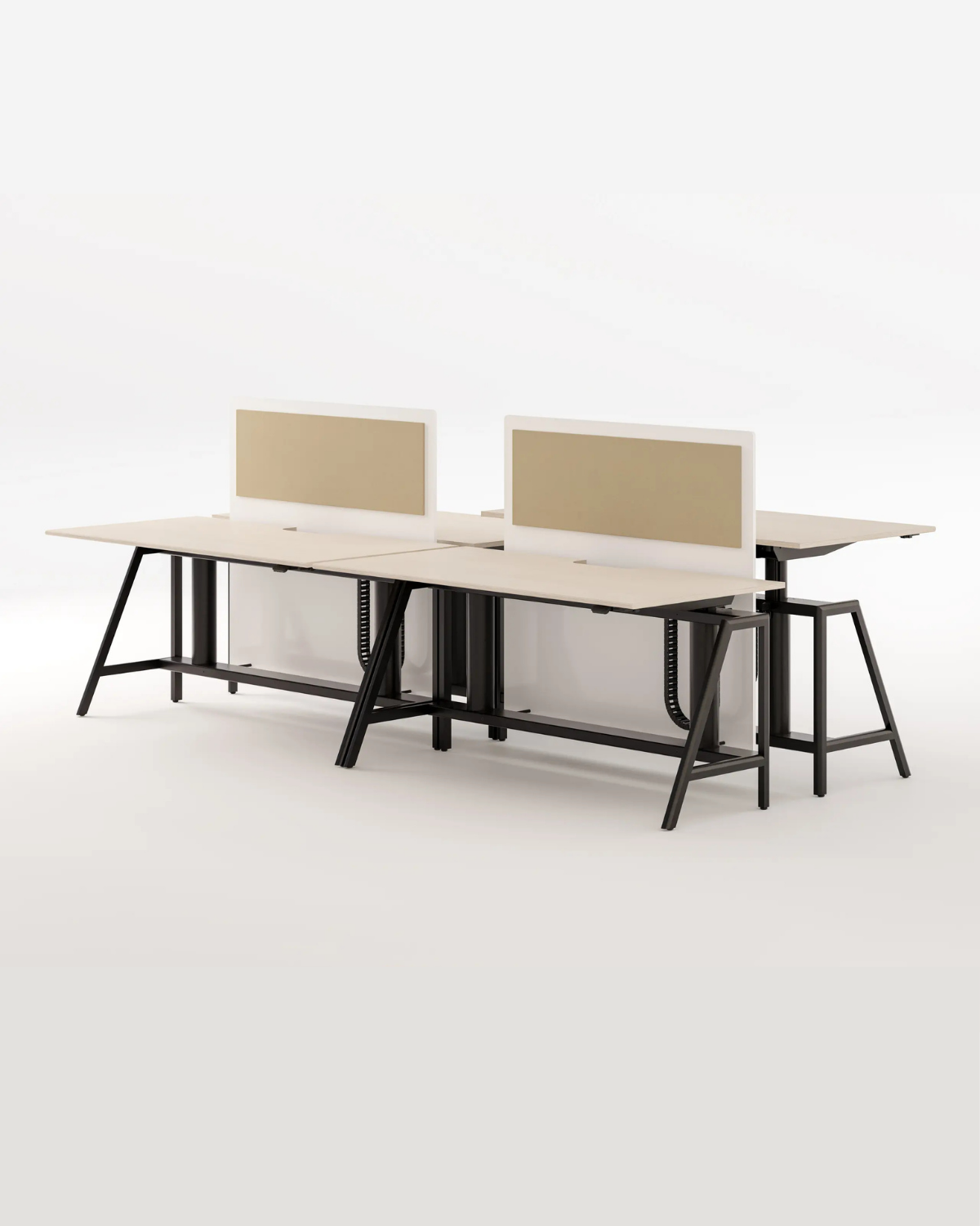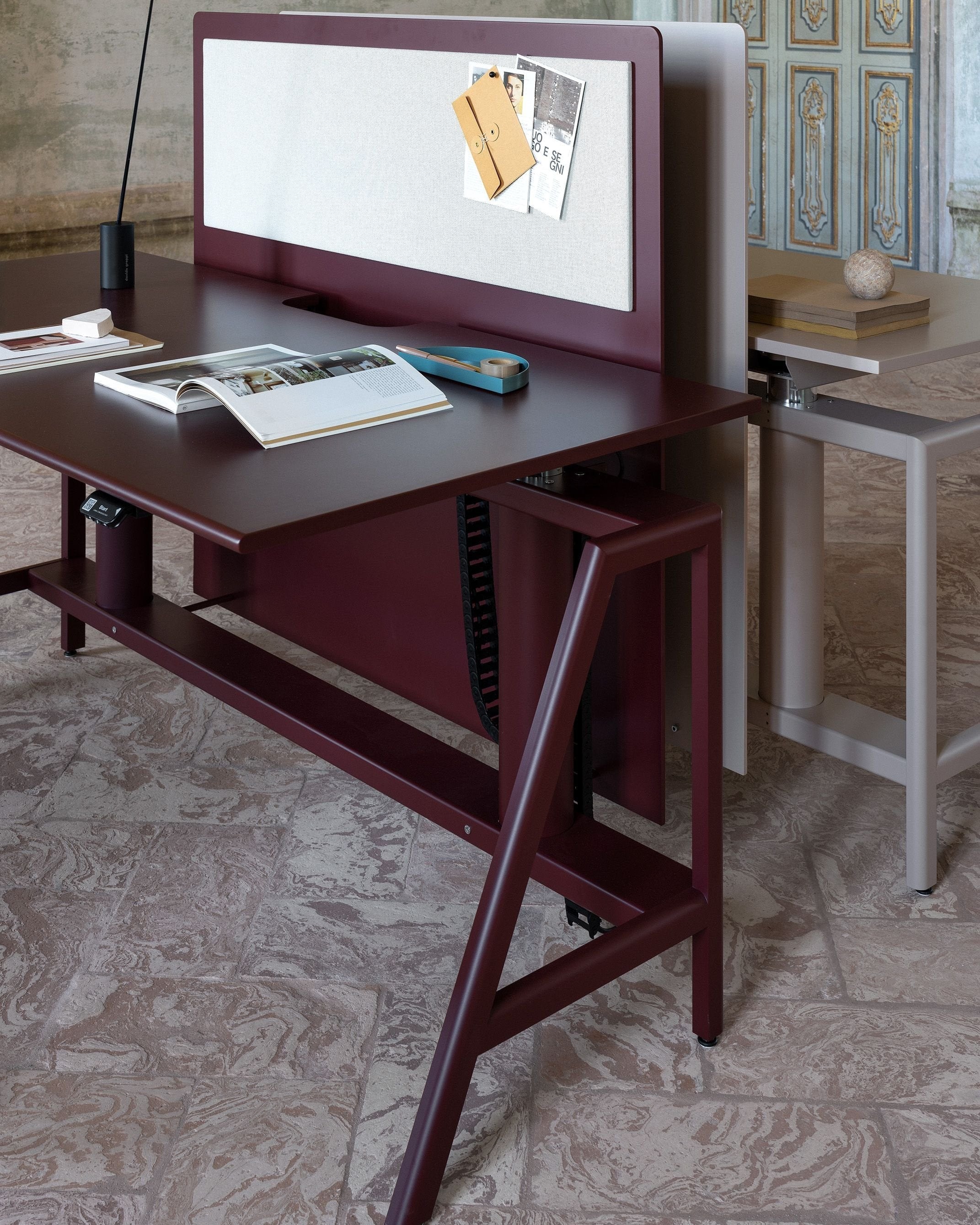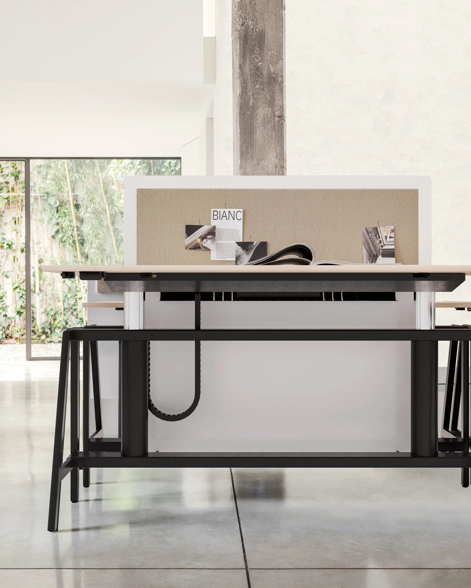 Solari is a system of desks that can be elevated in height, designed to facilitate teamwork but also moments of privacy and concentration. Suitable for different environments: from open spaces in representative offices to more domestic spaces, it is distinguished by its special dividing panel and trestle leg. Solari is ideal where a combination of modernity and elegance is required. Solari's outstanding features are the unique and attractive design of the trestle structure, the elegant sound-absorbing partition panel, and a hidden wiring system that allows for the combination of technical and aesthetic requirements.