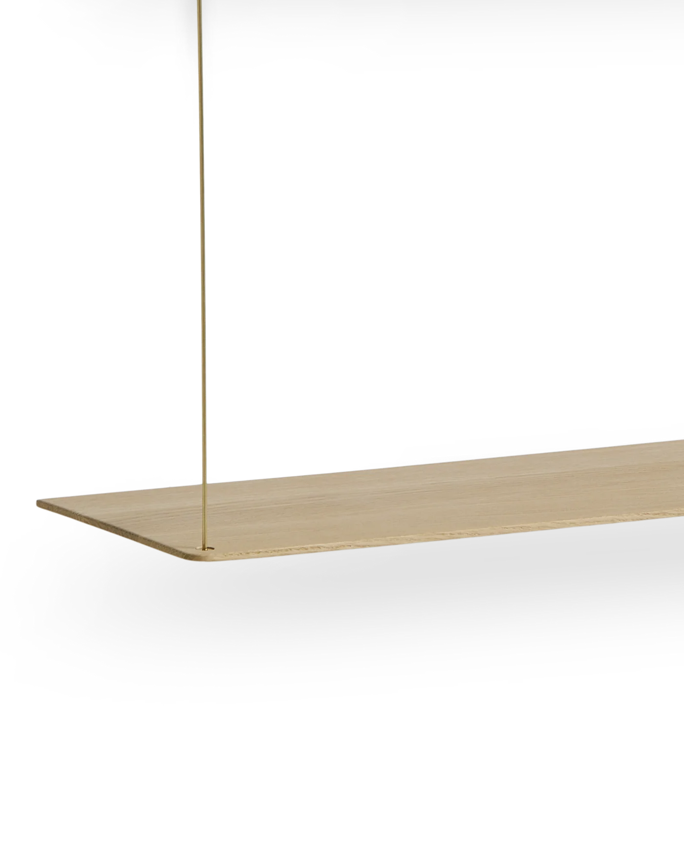 Materials: Solid white pigmented oak shelves and brass fittings metal wire